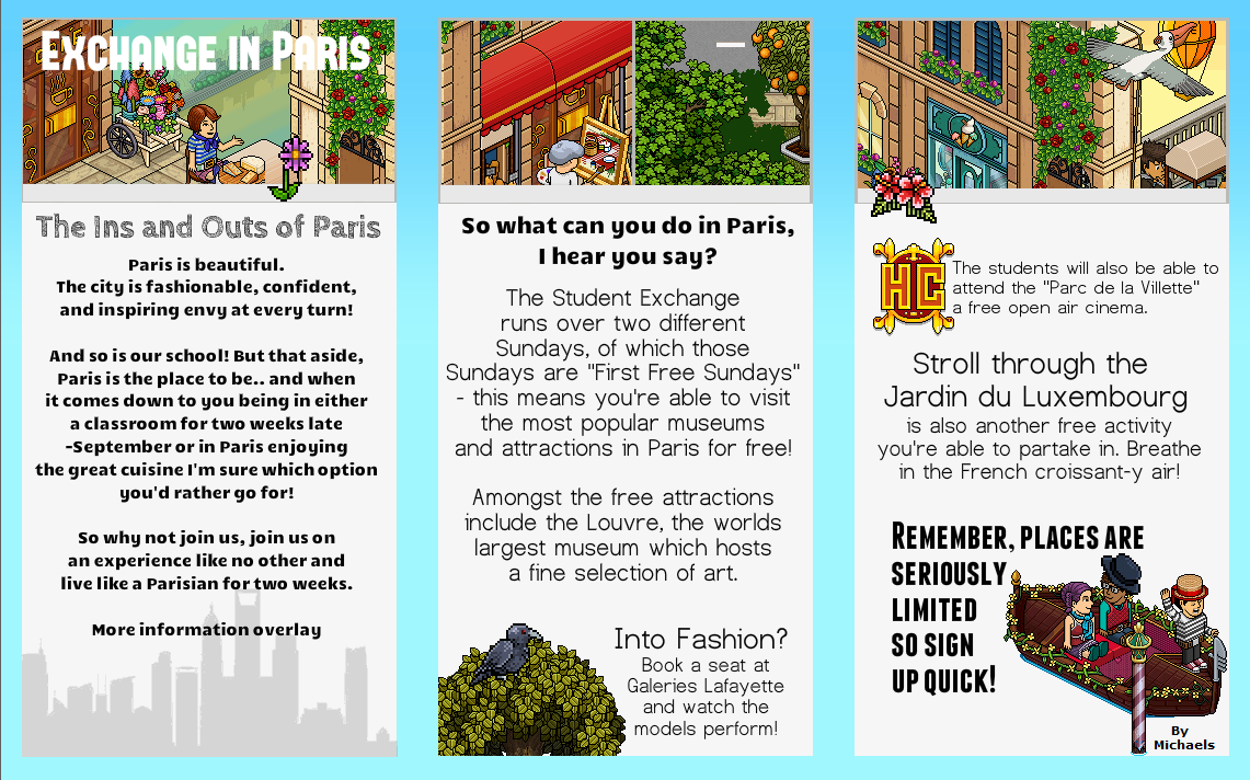 Congratulations to these 10 pixel-artists who did a fabulous job making brochures to convince their friends to take part in Exchange in Paris next year!