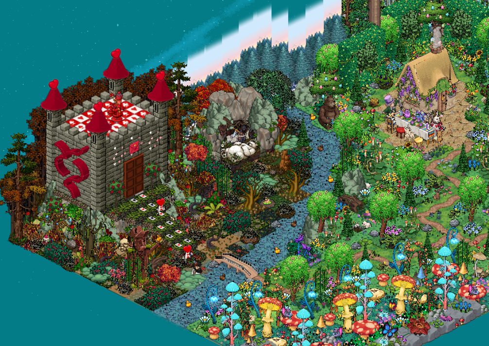 Greg. nos ha regalado su propio yin y yang a lo Alicia, enfrentando a la reina de corazonas contra la reina de picas pero reservando un momento para tomarse un té. Porque en Habbo, en cualquier conflicto se saca tiempo para charlar, cambiarse el look varias veces y subir de nivel en las Recompensas. Es un mundo loco, loco. Y es todo vuestro. Que la vista en miniatura no os impida acercaros a recorrer y disfrutar de su grandeza.